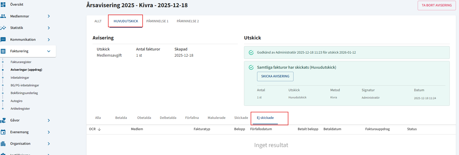 Härifrån ser du en vy över alla skapade fakturor i denna medlemsavisering.