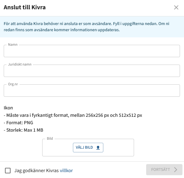 Organisationen är redan registrerad som avsändare i Kivra. Vänligen kontakta oss så hjälper vi er att aktivera anslutningen på er befintliga avsändare.