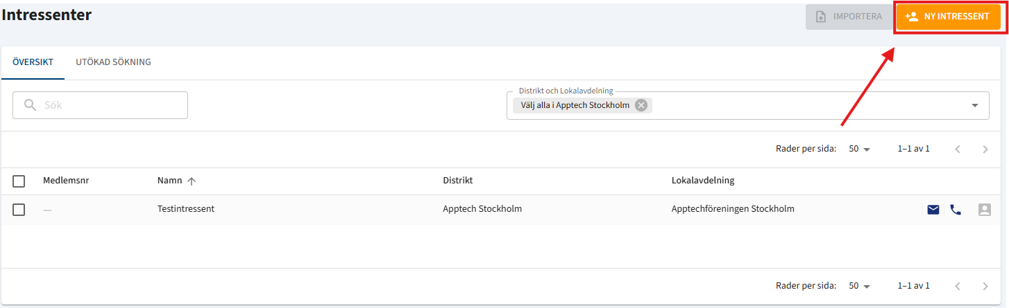 För att skapa en ny intressent manuellt, klicka på den orange knappen "NY INTRESSENT"