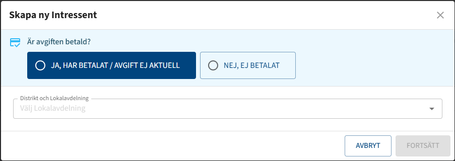 - Ja, har betalat - Välj detta om ni redan mottagit betalning från intressenten för sitt köp, eller om intressenten ska vara avgiftsbefriad. Detta val ger intressenten status "Betald".